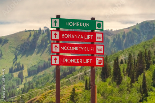Ski lifts and hiking trails signs view in Park City Utah resort at off season