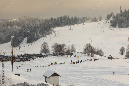 Ski resort during freezing winter. High quality photo.
