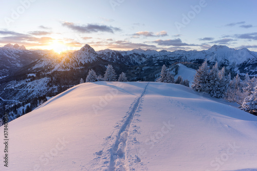Ski tracks on snowcapped peak of Schonkahler mountain at sunrise