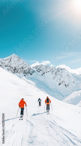 Skiers Descending Snowy Mountain Slope On A Sunny Day