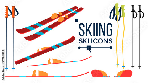 Skiing Icons Vector. Different View. Winter Sport Equipment. Equipment. Mountain Vacation, Activity, Travel. Isolated Flat Illustration