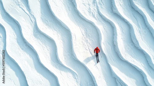 Skiing through untouched powder snow, a vibrant red jacket contrasts against the pristine white peaks and intricate wave patterns below