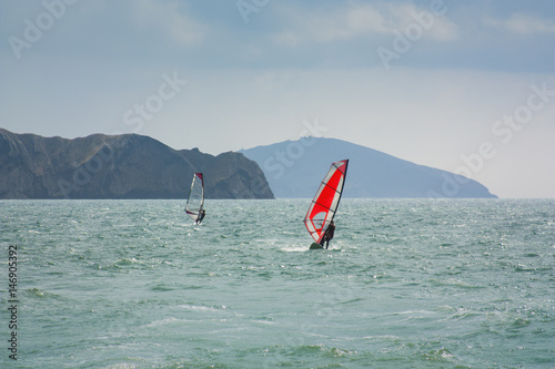 windsurf, mountain, beach, sea, sky, ocean, summer, tour tourism, recreation, vacation, holiday, travel, sail, board, ride, wave, water