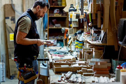 Skilled carpenter crafting wood items in a busy workshop space