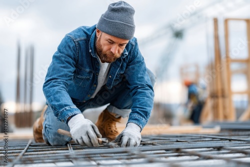 Skilled laborer working on construction site in cold weather while assembling steel rebar for new building