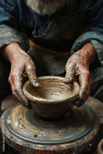 Skilled Potter Shaping Clay on a Spinning Wheel, Capturing the Art of Traditional Pottery Craftsmanship with Focused Hands