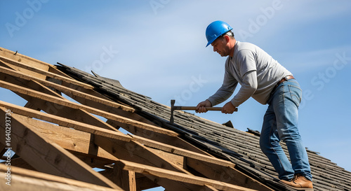 construction, building, work, labor, outdoors, renovation, repair, home, house, residential, property, industry, trade, expertise, skill, safety, development, improvement, maintenance, progress, career, professional, shopkeeper, contractor, working man, handyman, man, adult, roofer, carpenter, hard hat, hammer, tool, shingle, roof, wooden, rafter, frame, structure, working, repairing, installing, constructing, hammering, diligence, focused, blue skies, bright