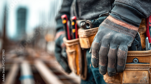 Skilled Worker with Gloves and Tool Belt on Construction Site in Urban Environment