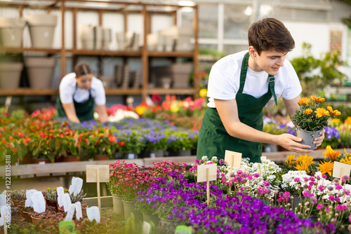 Skilled young salesman working in garden shop, inspecting and preparing for sale ornamental potted plants of blooming gazania