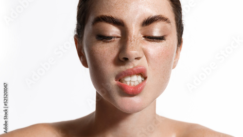 Skin care and women beauty. Gorgeous woman with healthy natural face and white smile, showing teeth, looking daring and sassy at camera, standing over white background