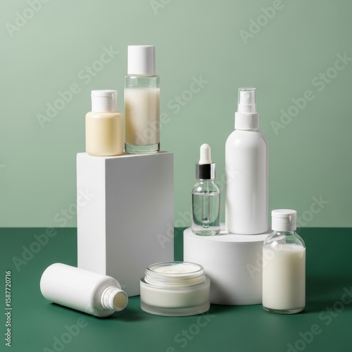 Skincare beauty products arranged on white podiums for commercial cosmetic mockup display