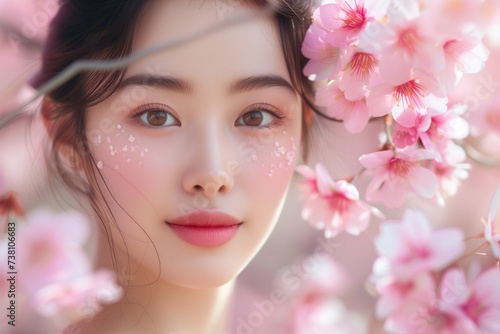 model, sakura, cherry blossom, fall, beauty, cosmetic, routine, winter, skin, healty, industry, photoshoot, asian, face, cheek, lip, eye, brunette, copy space, copy space, woman, flower, care, make-up, pink, skincare, make-up, closeup