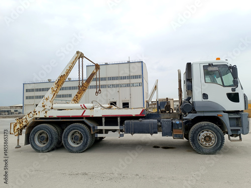 Skip loader on the factory premises. Skip truck surrounded by containers and factory in the open air