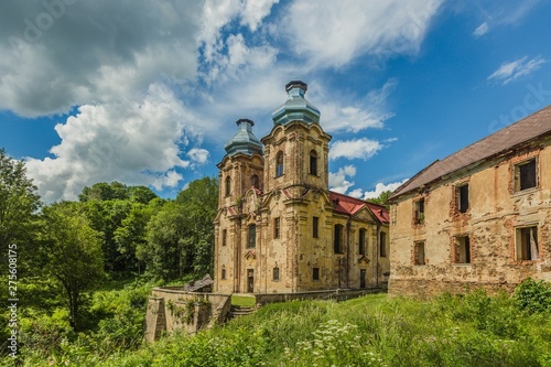 ruin, building, house, 2, sunlight, stone, stair, religion, high, grey, grass, church, 18th century, pilgrimage, old, historical, site, blue, sky, white, cloud, day, spring, june, czech republic, hill, view, scenery, bright, tour tourism, travel, landmark, landscape, history, europa, virgin mary, sunny, tower, red, green, roof, tree, baroque, editorial, roman catholic