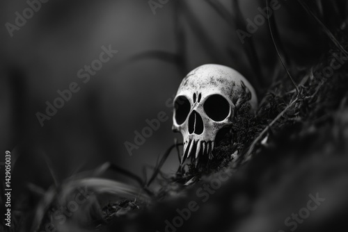 Skull Among Grass and Moss in Dark Monochrome