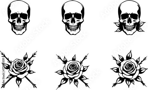 Skull with Roses Vector Design – Gothic Tattoo Silhouette Artwork