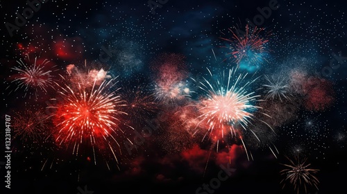 sky, red, white, blue, sparkle, illustration, fireworks, display, night, vibrant, beautiful, celebration, explosion, festive, pyrotechnic, illumination, glow, burst, festival, patriotic, holiday, show, light, colours, bright, night time, skyline, glistering, shine, festivity, joy