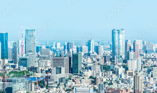 japan, tokyo tower, shinjuku, city, blue skies, city landscape, bright light, modern, panoramic, background, architecture, skyscraper, asia, realtor, landmark, tower, clean, clear, sun, morning, white, summer, town, panorama, scene, financial, green tree, sunny day
