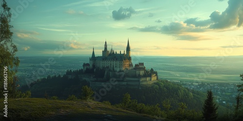 Skyline view featuring a castle, captured from a scenic hilltop. The skyline showcases stunning architectural elements combined with the prominence of the castle in the landscape.