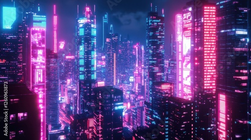 Skyscrapers covered in pulsing pink and blue crypto lights