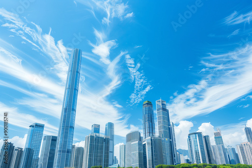 skyscraper, tower block, building, architecture, city landscape, urban, skyline, modern, tall, blue skies, white cloud, sunny day, bright, business building, corporate, downtown, metropolitan, city, tower, exterior, business district, real estate, construction, concrete, steel, vertical, outdoors, perspective, landmark, commercial, headquarter, infrastructure, development, elegant, professional, contemporary, business, financial district, high technology, sky, sunlight, cloudscape, panoramic, futuristic
