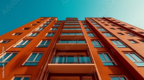 Skyward Reach: A low-angle shot of a tall, modern residential building, bathed in sunlight against a vibrant blue sky, with its geometric design and symmetrical facade.