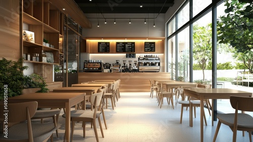 sleek and clean coffee shop with light wood tables, minimalist chairs, and a stylish coffee bar serving freshly brewed drinks.