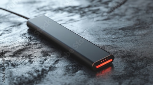 device, technology, contraption, electronic, charger, charging, power, battery, modern, sleek, black, rectangular, dark, surface, red, light, indicator, portable, slim, minimal, design, futuristic, innovation, digital, interface, connection, cable, wire, current, energy, hardware, appliance, tool, object, item, product, future, progress, style, elegant, sophisticated, compact, small, simple, clean