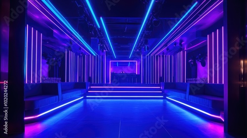 Sleek club stage architecture with neon blue and purple lighting, offering wide copy space for promotional material.