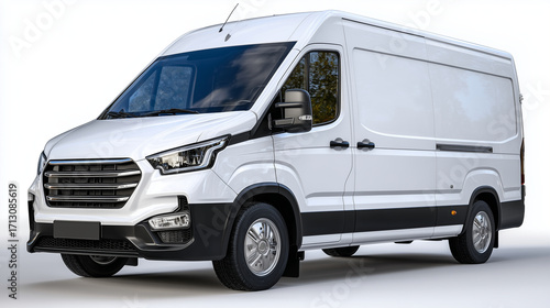 Sleek delivery van mockup on pure white background, studio lighting highlighting contours and metallic details, clean minimal shadows emphasizing vehicle design