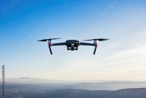 sleek, drone, hovering, against, clear, blue, sky, casting, shadow, below, expansive, landscape, open, space, side, design, element, subtile, cloud, formation, depth, setting, modern, technology, potential, aerial, surveying, concept, copy space, texture, sharpened, colours, minimal, detail, creative, inspiration