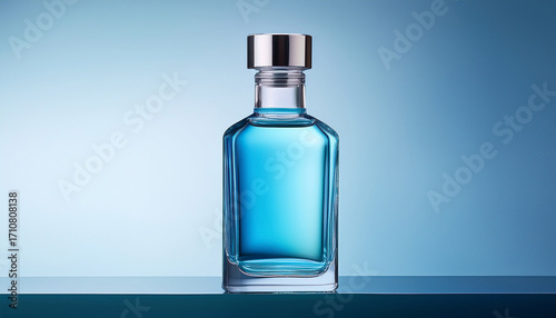 Sleek Glass Bottle Filled With Light Blue Liquid Stands Elegantly Against Soft Gradient Background Design Exudes Modern Sophistication And Freshness Perfect For Fragrance