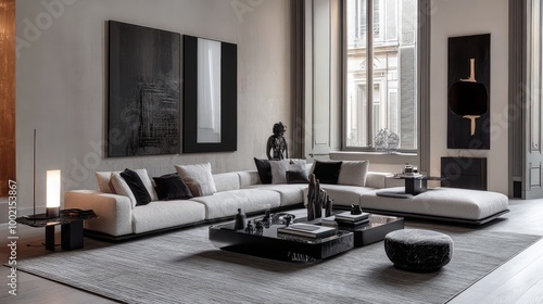 Sleek, high-end living room with modern furniture, black-and-white decor, and a minimalist aesthetic.