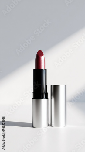 Sleek lipstick in silver tube, showcasing rich, deep red color. minimalist design highlights product elegance and luxury, perfect for enhancing beauty