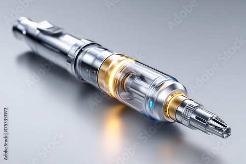 electronic, device, technology, modern, futuristic, sleek, metallic, gold, silver, chrome, glasses, transparent, light, glow, internal, component, innovative, clean, simple, shot, product, digital, advanced, engineering, precision, battery, innovation, tobacco, alternative, smoking, quit, habit, wellness, health, condensed, oil, wax, portable, apparatus, instrument, contraption, beautiful, colourful, bright, creative