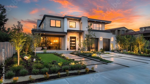 Sleek modern home surrounded by a well-maintained garden, with the vibrant colors of a sunset sky creating a peaceful ambiance.