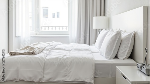 minimalist, hotel room, double bed, soft, sleek, natural light, interior design, contemporary, clean, neat, cosy, comfortable, serene, stylish, luxurious, relaxing, airy, bright, relaxation, vacation, hospitality