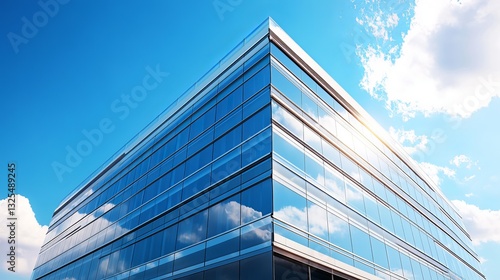 Sleek modern office building with glass facade reflecting clear blue sky