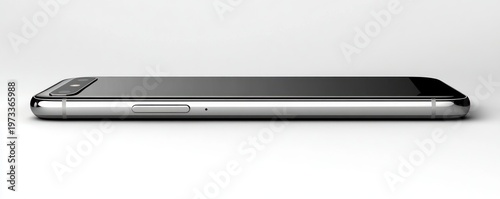 sleek modern smartphone on white surface showing black glass screen, polished metallic frame, side button and raised dual camera module, minimalist refined aesthetic