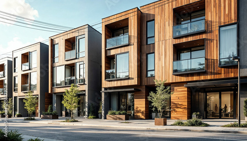 Sleek, multi-story buildings with gray exteriors and wooden paneling in a serene urban setting.