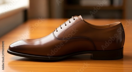 shoe, oxford, leather, brown, footwear, fashion, style, elegant, formal, polished, sleek, business, professionalism, luxury, quality, success, corporate, attire, clothes rack, menswear, apparel, accessory, product, retail, studio, closeup, detailed, indoor, wood, wooden, surface, lifestyle, modern, traditional, sophisticated, clean, smart, exclusive, designer, handcraft, comfort, office, event, occasion, gentleman