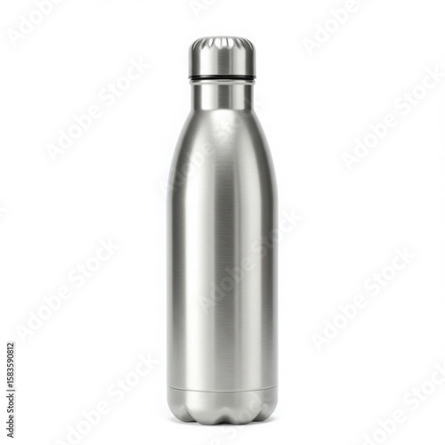 water, bottle, metal, recyclable, silver, brushed, stainless, steel, hydratation, beverage, container, modern, design, sleek, minimalist, studio, shot, product, photo, isolated, object, white, background, empty, travel, sport, environmentally friendly, sustainable, thermos, insulated, cap, screw, textured, liquid