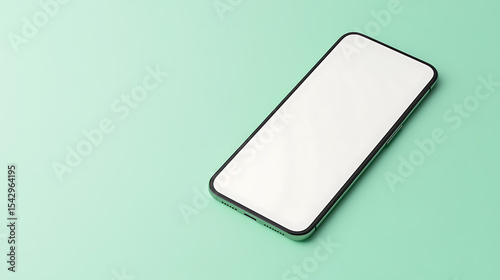Sleek smartphone with a blank white screen on a mint green background. Perfect for showcasing apps or websites. Clean, modern design, angled view.