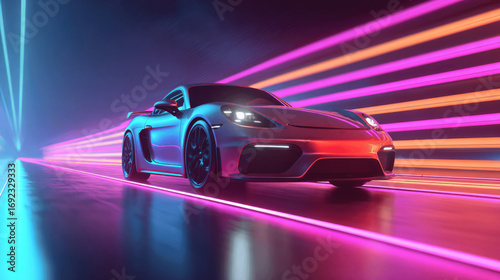 Sleek sports race car against vibrant neon lights. Lighting dynamic ambiance, vehicle design and high speed move. Fast auto motion. Automotive luxury branding. Abstract movement glow background.
