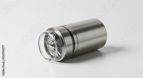 grinder, stainless, steel, device, kitchen, tool, clear, plastic, lid, cylinder, appliance, cooking, container, brushed, metal, culinary, food, preparation, utensil, tableware, contraption, equipment, mill, modern, counter, top, perspective, shadow, surface, object, background, indoor, horizontal, white, cylindrical, simplicity, design