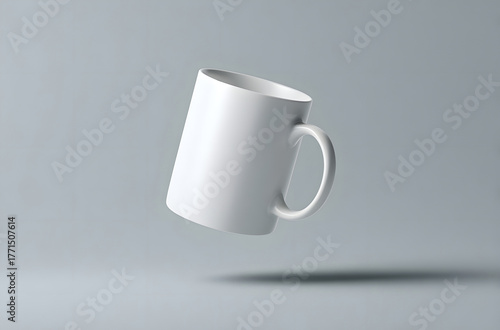 sleek white ceramic mug floating or levitating in the air, isolated against a smooth gray background. clean and modern graphic mockup