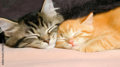 kitten, sleeping, cat, animal, pet, cute, adorable, furry, nap, cosy, friendship, companionship, mammal, felino, wildlife, nature, domestic, fluffy, soft, playful, young, innocent, sweet, charming, lovely, gentle, peaceful, calm, relaxed, rest, slumber, togetherness, bond, love, affection, closeup, detailed, hi-res, image, photo, photo, realistic