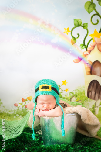 cute, caucasian, newborn, portrait, baby, infant, adorable, beautiful, bucket, white, little, human, studio, small, boy, sleeping, sleep, 1, children, costume, comfortable, childhood, posing, basket, metal, rug, wood, brown, yellow, green, irish, holiday, patrick, hat, coin, gold, pot, dwarf, st, masquerade, lucky, treasure, gnome, leprechaun, spring, ireland, cartoon, house, fairy