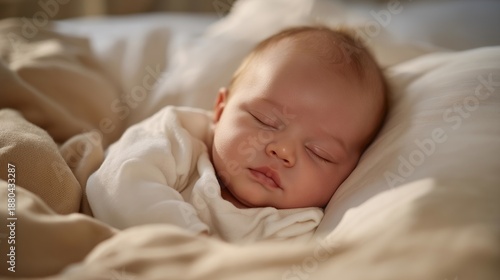 Sleeping newborn baby in a warm, minimal nursery, calm atmosphere highlighting simplicity, care, infant wellbeing, comfort, and mindful parenting moments. cinematic color correction, natural uneven