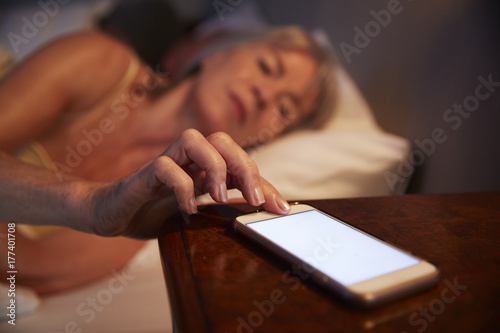 Sleepless Senior Woman In Bed At Night Checking Mobile Phone